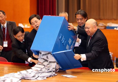 12月2日深夜,香港選管會主席彭鍵基[右]及政制及內(nèi)地事務局局長林瑞麟[左二]到達票站,開啟票箱,票站內(nèi)點票工作隨即展開。當日,香港立法會港島區(qū)補選共有八名候選人競逐一個議席,分別是:柳玉成、李永健、蕭思江、葉劉淑儀、蔣志偉、凌尉云、陳方安生、以及何來。