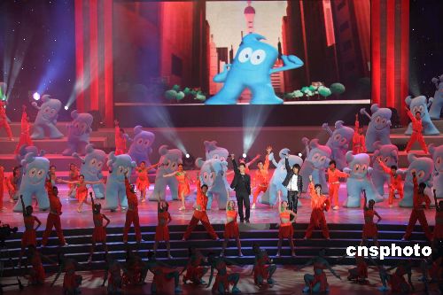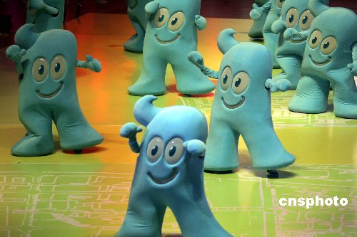 十二月十八日晚,備受海內(nèi)外矚目的中國(guó)二0一0年上海世博會(huì)吉祥物在上海大舞臺(tái)揭開(kāi)神秘面紗。一個(gè)返璞歸真的、漢字“人”的藍(lán)色卡通造型——吉祥物“海寶”正式亮相!昂殹奔槲锏恼Q生,是海峽兩岸設(shè)計(jì)師共同的智慧結(jié)晶。其最初使用漢字充當(dāng)吉祥物的創(chuàng)意始于臺(tái)灣知名設(shè)計(jì)師巫永堅(jiān),他的應(yīng)征作品漢字卡通形象“大寶”在全球兩萬(wàn)六千多件應(yīng)征作品中脫穎而出,再經(jīng)過(guò)上海設(shè)計(jì)名家邵隆圖及其團(tuán)隊(duì)的整合、再設(shè)計(jì),“海寶”最終定型。中新社發(fā) 潘索菲 海牛 攝