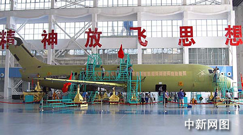 中國首架自主知識產(chǎn)權(quán)的噴氣支線客機(jī)ARJ21正在總裝中。