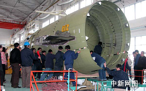 中國首架自主知識產(chǎn)權(quán)的噴氣支線客機ARJ21總裝前中后機身上下對合。