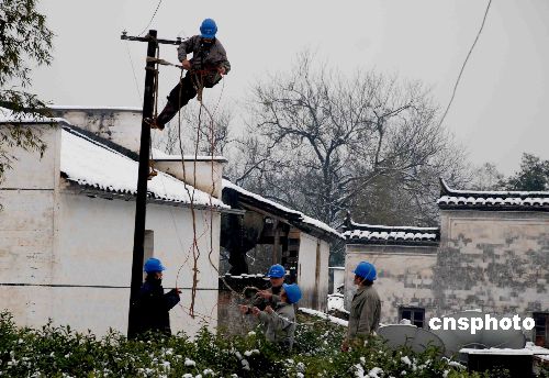 1月29日,江西婺源縣城鄉(xiāng)各地下起鵝毛般的大雪,造成該縣多個(gè)地方線路損壞,婺源縣供電公司成立“電力110”搶修小分隊(duì),冒雪奔赴全縣各鄉(xiāng)、鎮(zhèn)、村進(jìn)行線路維護(hù)搶修,及時(shí)恢復(fù)供電,確保了人民群眾生產(chǎn)生活用電。中新社發(fā) 王國紅 攝
