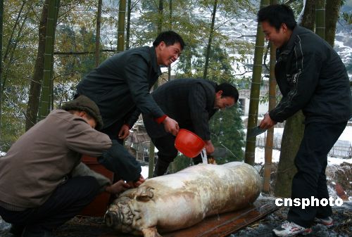 2月4日是農(nóng)歷的“立春”節(jié)氣,被冰雪封凍20多天的廣西融水縣滾貝鄉(xiāng)災(zāi)民殺豬喜迎新春。由于得到當(dāng)?shù)卣募皶r(shí)救助,面對(duì)遭受57年來最嚴(yán)重的雨雪冰凍災(zāi)害,災(zāi)民們對(duì)未來依然充滿信心。中新社發(fā) 張耀華 攝