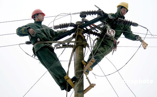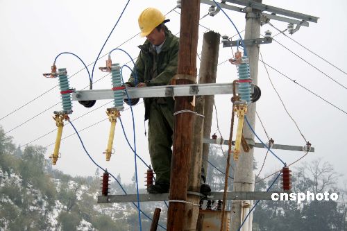 2月5日,婺源縣供電公司工作人員在贛浙皖邊界的江灣鎮(zhèn)大瀲村搶修。雪災(zāi)造成江西省婺源縣山區(qū)大部分供電系統(tǒng)中斷,大山里的村民無(wú)法正常用電。國(guó)家電網(wǎng)公司江西省電力公司婺源縣供電公司立即組織“黨團(tuán)員突擊搶修隊(duì)”和“電力110”搶修小分隊(duì)奔赴山區(qū)搶修線路。中新社發(fā) 王國(guó)紅 攝