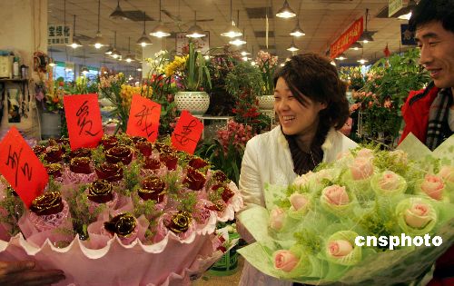 二月十三日,形形色色的口彩玫瑰亮相上海情人節(jié)花市。圖為逛花市的女性面對由五十七朵玫瑰組成的諧音“吾愛我妻”口彩玫瑰開心不已。中新社發(fā) 潘索菲 攝