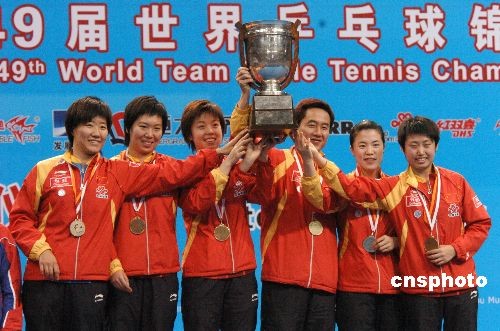 3月1日晚,中國隊在四十九屆世乒賽女團決賽中3比1擊敗新加坡隊奪得冠軍,連續(xù)第8次舉起考比倫杯。 中新社發(fā) 柯小軍 攝