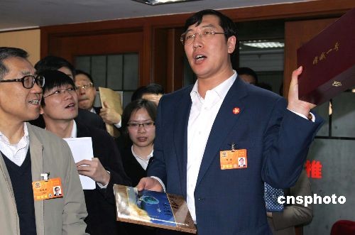 三月四日,在全國政協(xié)小組討論會上,政協(xié)委員、億陽集團董事長鄧偉向委員們贈送“嫦娥一號”模型。中新社發(fā) 潘索菲 攝