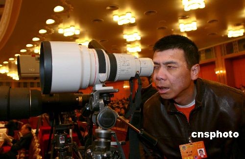 圖:馮小剛委員借“大炮”細(xì)觀會(huì)場(chǎng)