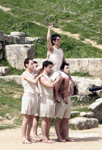 希臘當(dāng)?shù)貢r(shí)間3月24日,北京二00八年奧運(yùn)會(huì)圣火采集儀式在古奧林匹亞競(jìng)技場(chǎng)舉行,最高女祭司順利采集到火種,圖為采集儀式上五名男祭司表演。中新社發(fā) 王歡 攝