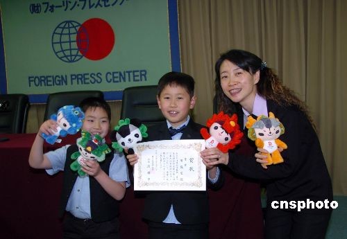 年僅9歲的東京都市立小學(xué)二年級(jí)學(xué)生布施望(中)以《五環(huán)夢(mèng)》為題的漢語(yǔ)作文獲得學(xué)生組一等獎(jiǎng)。中新社發(fā) 段躍中 攝