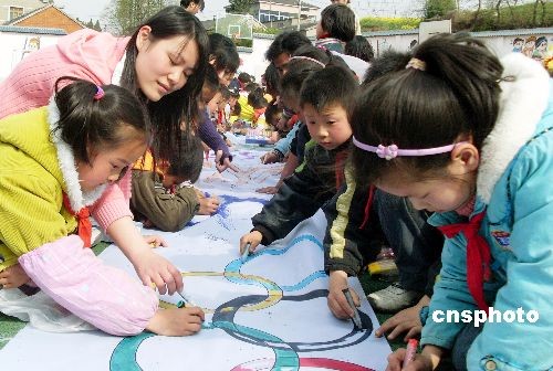 4月2日,江蘇大學(xué)人文學(xué)院50多名大學(xué)生走進(jìn)鎮(zhèn)江市七里甸中心小學(xué),與該校學(xué)生一起開展“大小學(xué)子共繪奧運(yùn)畫卷”活動(dòng),學(xué)子們?cè)诎倜组L(zhǎng)卷上共同繪制了奧運(yùn)福娃、五環(huán)標(biāo)志和各類運(yùn)動(dòng)項(xiàng)目等圖案,表達(dá)他們對(duì)北京奧運(yùn)會(huì)的期盼和祝愿。作者: 石玉成