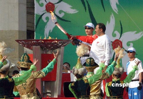4月2日,北京奧運會的火炬?zhèn)鬟f于中午12時從阿拉木圖麥迪奧山大壩出發(fā),五個小時后在阿斯塔納廣場舉行慶典活動。這是奧運圣火首次來到哈薩克斯坦,當?shù)貙κセ饌鬟f相當重視。圖為當天最后一位火炬手、2000年奧運會拳擊冠軍葉爾馬罕·伊布拉莫夫用手中的火炬點燃圣火盤。這預(yù)示著北京奧運圣火境外傳遞首站火炬?zhèn)鬟f落幕。 中新社發(fā) 沈晨 攝