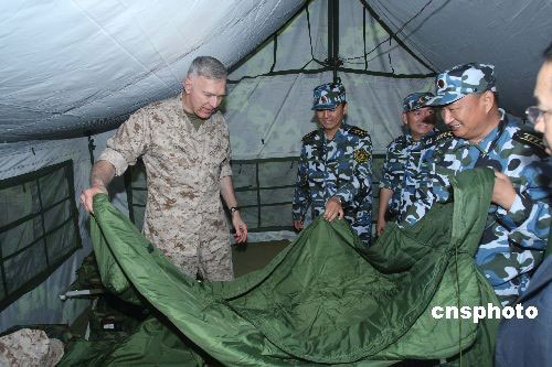 圖為美國(guó)海軍陸戰(zhàn)隊(duì)司令參觀中國(guó)海軍陸戰(zhàn)隊(duì)野戰(zhàn)睡具。中新社發(fā) 李唐 攝