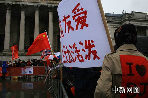 圖:倫敦特拉法加廣場上歡迎火炬的中國留學(xué)生