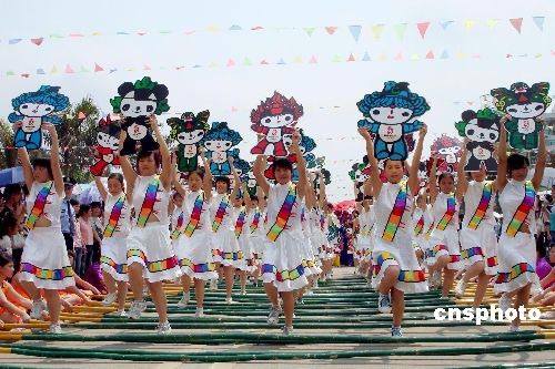 4月8日是中國最大的少數(shù)民族——壯族富有民族特色的傳統(tǒng)節(jié)日“三月三”歌圩!爸袊鴫燕l(xiāng)”廣西武鳴縣2008名壯族男女身著各色鮮艷的民族服裝,排著整齊的表演方陣,在近千米長的竹杠陣內(nèi),跳起民族傳統(tǒng)的竹杠舞歡慶節(jié)日,喜迎奧運(yùn)會(huì)。中新社發(fā) 黃艷梅 攝