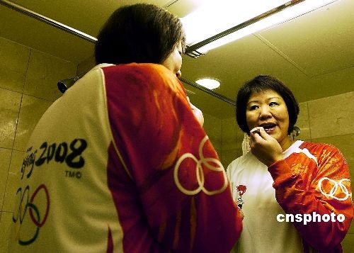 圖為郎平在圣火傳遞前化妝。 陳鋼 攝