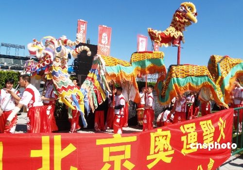 圖:華人華僑舞獅舞龍慶祝奧運(yùn)圣火傳遞