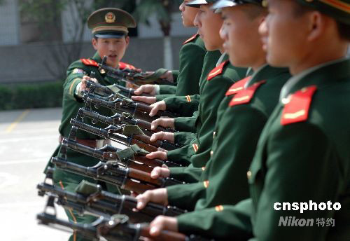 4月10日,武警南京支隊官兵在進行訓練。連日來,南京武警官兵積極備戰(zhàn)奧運安保工作,通過隊列及各種禮儀、處置突發(fā)事件等方面進行嚴格正規(guī)的軍政素質(zhì)訓練,從而不斷提升執(zhí)勤官兵形象,為維護一方穩(wěn)定做貢獻。中新社發(fā) 唐占軍 攝