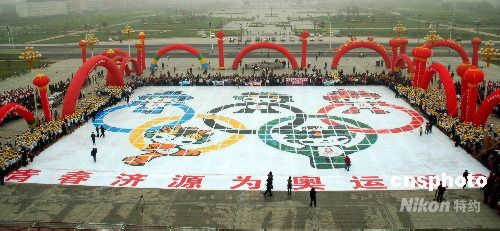 4月12日,愚公家鄉(xiāng)河南省濟(jì)源市千名小學(xué)生在濟(jì)源世紀(jì)廣場(chǎng)2008平方米的畫布上共同繪制巨型福娃,表達(dá)濟(jì)源市青少年學(xué)生對(duì)北京奧運(yùn)會(huì)的向往和美好祝愿。中新社發(fā) 平白 攝