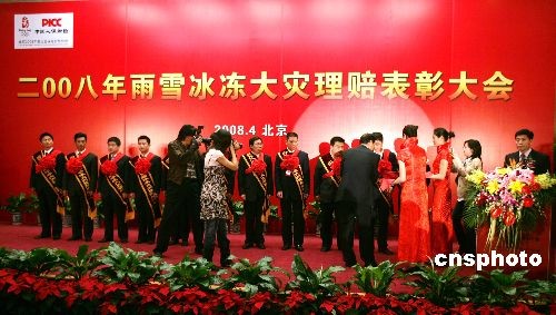 中國人民財產(chǎn)保險股份有限公司(PICC)在北京舉行2008年雨雪冰凍大災(zāi)理賠表彰大會,對該公司在此次大災(zāi)理賠工作中取得突出成績的單位(集體)和個人進(jìn)行表彰。中新社發(fā) 楊可佳 攝