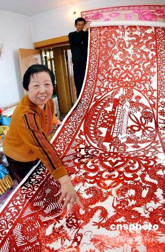 4月14日,由沈陽市民王玉芬創(chuàng)作的《百龍迎奧運》巨幅剪紙作品亮相沈陽,這幅剪紙作品長11米,高1.2米,由王玉芬耗時兩年時間創(chuàng)作完成,整幅作品由100條形態(tài)各異的龍與奧運標(biāo)識組成,表達(dá)龍的子孫遙祝北京奧運會的成功舉辦。 中新社發(fā) 羅瀾 攝