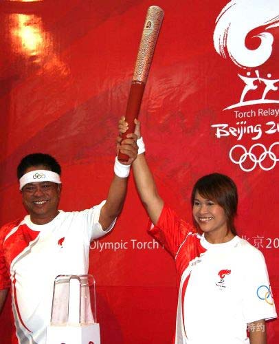 4月17日,泰國奧委會主席育塔薩先生在泰國國家體育館就奧運(yùn)火炬?zhèn)鬟f活動舉行新聞發(fā)布會上表示,曼谷為迎接北京奧運(yùn)會圣火已經(jīng)做好一切準(zhǔn)備。圖為北京奧運(yùn)會火炬?zhèn)鬟f泰國站第一位火炬手曼谷市政府副次長阿南(左)和最后一位火炬手曾獲得奧運(yùn)會金牌的女子舉重運(yùn)動員巴維娜(右)。 作者: 顧時(shí)宏