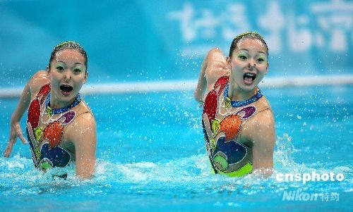 4月18日,“好運(yùn)北京”2008花樣游泳奧運(yùn)資格賽結(jié)束了雙人自由自選項(xiàng)目的爭(zhēng)奪,中國(guó)姐妹花蔣文文/蔣婷婷以總成績(jī)96.083的得分繼多哈亞運(yùn)會(huì)之后再度擊敗日本名將鈴木繪美子/原田早穗,摘得銀牌。中新社發(fā) 富田 攝