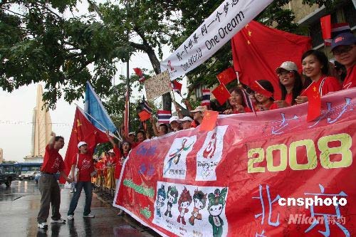 圖為中國留學(xué)生高舉國旗為曼谷奧運(yùn)圣火傳遞搖旗吶喊:“中國!加油!北京奧運(yùn)一定成功!”。 顧時(shí)宏 攝