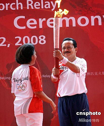 圖為雅加達(dá)站第一棒火炬手、雅加達(dá)特區(qū)省長法烏茲手(右)從印尼奧委會主席莉達(dá)手中接過火炬。作者: 沈晨