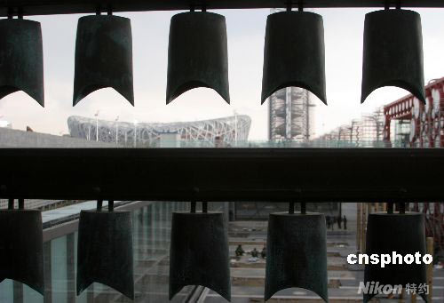4月21日,數(shù)百只懸掛在高達(dá)十余米框架上的青銅編鐘和“吉慶大鼓”在北京奧林匹克中心區(qū)整體亮相,充滿古韻的青銅編鐘和時代氣息的紅色大鼓與現(xiàn)代建筑“鳥巢”遙相輝映,隨風(fēng)樂動的編鐘和大鼓不時發(fā)出陣陣清脆悅耳的聲音和激情澎湃的“咚咚”聲。據(jù)悉,建成后的奧林匹克公園下沉花園將展現(xiàn)七個中國特色的院落。七個院落截取了皇城根的城市片段,在城市的中軸線和現(xiàn)代的體育場館之間,創(chuàng)造出全新景象。中新社發(fā) 吳芒子 攝