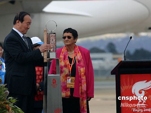 圖為北京奧組委執(zhí)行副主席蔣效愚(左)在機(jī)場(chǎng)安放奧運(yùn)圣火燈。 作者: 沈晨