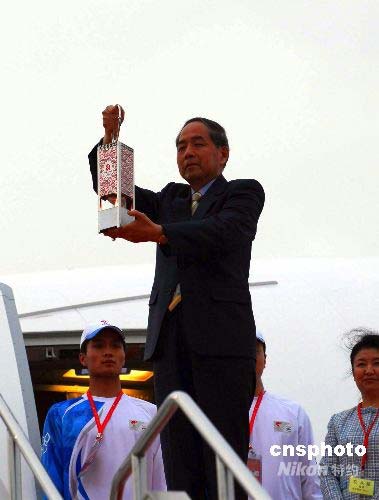 北京奧運(yùn)會組織委員會副主席李炳華先生持北京奧運(yùn)火種走出專機(jī)。中新社發(fā) 侯宇 攝