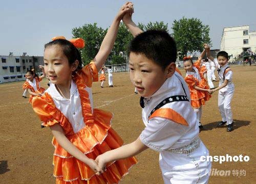 圖:山東棗莊中小學(xué)生跳起校園集體舞迎奧運(yùn)