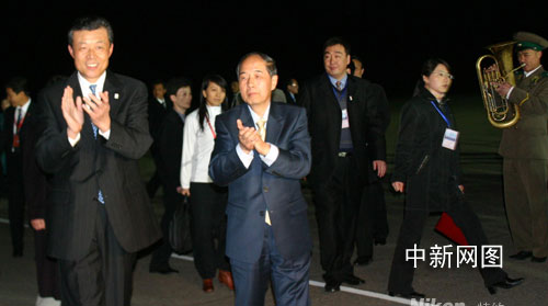 4月28日凌晨0時20分,載有北京奧運(yùn)圣火的“奧運(yùn)圣火號”平穩(wěn)地降落在平壤國際機(jī)場。朝鮮首都平壤是北京奧運(yùn)圣火海外傳遞“和諧之旅”的第18站。這是奧運(yùn)圣火自一九三六年開始傳遞活動以來,首次來到朝鮮。圖為北京奧組委執(zhí)行副主席李炳華(左二)與中國駐朝鮮大使劉曉明(左)在機(jī)場受到熱烈歡迎。沈晨 攝