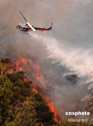 當(dāng)?shù)貢r(shí)間四月二十八日,消防直升機(jī)正在向著火區(qū)域撒下阻燃劑。洛杉磯近郊Sierra Madre的山林大火已經(jīng)燃燒了三天,過(guò)火面積近五百英畝,部分著火點(diǎn)距離居民區(qū)很近。當(dāng)天,當(dāng)?shù)刂行W(xué)全部停課,約一千名當(dāng)?shù)鼐用癖黄染o急撤離。這是當(dāng)?shù)厝嗄陙?lái)最大的山林大火。消防部門稱,美國(guó)聯(lián)邦、加州、洛杉磯縣和當(dāng)?shù)氐牧倜绬T正在現(xiàn)場(chǎng)滅火,至今沒(méi)有人員傷亡的報(bào)告。中新社發(fā) 張煒 攝