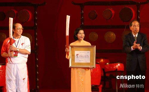 4月29日晚8時20分,在胡志明市第七軍區(qū)體育館內(nèi),越南奧委會主席阮明泰用手中的“祥云”火炬點燃圣火盆,北京奧運圣火在胡志明市的傳遞就此順利結(jié)束。胡志明市歷時近兩個鐘頭的傳遞,為北京奧運圣火“和諧之旅”國外19個城市的傳遞劃上圓滿句號。30日上午10時,北京奧運圣火將隨“奧運圣火號”飛往“東方之珠”香港,并于下午2時左右進入中國領(lǐng)土。圖為北京奧組委執(zhí)行副主席李炳華(右),向胡志明市副市長阮氏秋霞(中)頒發(fā)證書。中新社發(fā) 沈晨 攝
