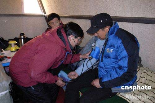 自4月28日,受邀采訪2008北京奧運(yùn)會(huì)火炬接力珠峰展示活動(dòng)的中外媒體入住珠峰大本營絨布新聞中心后,新聞中心住房、通訊、食宿和醫(yī)療等設(shè)施齊備且環(huán)保,為中外記者提供采訪保障。這里能找到世界上海拔最高的郵政代辦所,居住的活動(dòng)房、電力設(shè)施、網(wǎng)絡(luò)等所使用的均是環(huán)保材料,符合珠峰自然保護(hù)區(qū)的各項(xiàng)環(huán)保規(guī)定。圖為新聞中心的醫(yī)生在為有高原反應(yīng)的記者作身體檢查。 中新社發(fā) 盛佳鵬 攝
