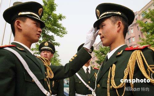 4月30日,北京飯店舉行迎奧運(yùn)倒計(jì)時100天千人簽字活動,北京飯店被國際奧委會正式確立為第29屆奧林匹克大家庭總部飯店,隨著2008北京奧運(yùn)會的臨近,飯店開展了以奧運(yùn)為目標(biāo)的服務(wù)技能比賽,投入到奧運(yùn)接待服務(wù)工作中。北京飯店千名員工,以及天安門國旗護(hù)衛(wèi)隊(duì)、中國人民解放軍軍樂團(tuán)參加奧運(yùn)倒計(jì)時100天儀式。 圖為在北京飯店奧運(yùn)倒計(jì)時100天儀式上天安門國旗護(hù)衛(wèi)隊(duì)?wèi)?zhàn)士整理軍容。 中新社發(fā) 錢興強(qiáng) 攝