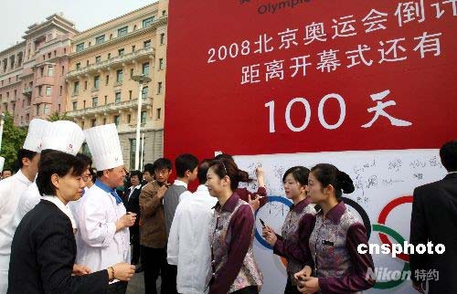 北京飯店千名員工,以及天安門國旗護(hù)衛(wèi)隊(duì)、中國人民解放軍軍樂團(tuán)參加迎奧運(yùn)倒計(jì)時(shí)100天千人簽字活動(dòng)。中新社發(fā) 錢興強(qiáng) 攝