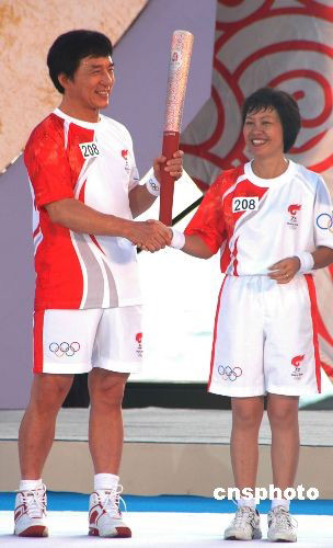 圖:成龍與三亞女鎮(zhèn)長共同點(diǎn)燃三亞圣火盆
