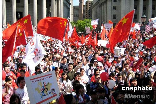 5月4日,紐約地區(qū)的華人華僑、留學生在曼哈頓弗利廣場舉行聲勢浩大的“和平奧運”集會,約萬人參加了當天的集會活動。中新社發(fā) 鄧悅 攝