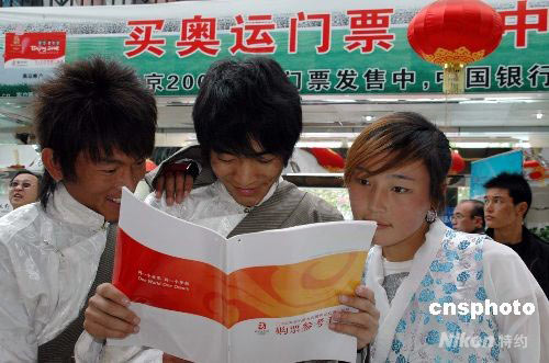 5月5日上午,北京奧運(yùn)會(huì)第三階段門票開始在拉薩銷售,該銷售工作與全國(guó)同步進(jìn)行。奧運(yùn)會(huì)門票的銷售,引起了拉薩市民的極大熱情。在西藏奧運(yùn)會(huì)門票銷售點(diǎn)的中國(guó)銀行西藏自治區(qū)分行里,購(gòu)買奧運(yùn)會(huì)門票的市民排起了長(zhǎng)長(zhǎng)的隊(duì)伍。圖為西藏大學(xué)的學(xué)生在看購(gòu)票參考手冊(cè)。 中新社發(fā) 周波 攝