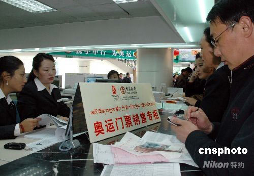 在西藏奧運(yùn)會(huì)門票銷售點(diǎn)的中國(guó)銀行西藏自治區(qū)分行里,購(gòu)買奧運(yùn)會(huì)門票的市民排起了長(zhǎng)長(zhǎng)的隊(duì)伍。 中新社發(fā) 周波 攝