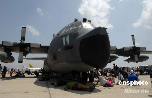 圖為許多參觀者在C-130大力神飛機(jī)陰影下休息。中新社發(fā) 張煒 攝
