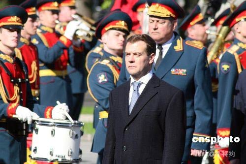 俄羅斯新任總統(tǒng)梅德韋杰夫來到克里姆林宮西北側(cè)紅墻下的亞歷山大花園,向無名烈士墓敬獻(xiàn)花圈,紀(jì)念衛(wèi)國戰(zhàn)爭勝利63周年。這是梅德韋杰夫就任總統(tǒng)后的首場正式活動。中新社發(fā) 田冰 攝