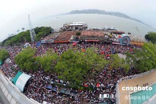 5月10日,圣火盆于16時18分在汕頭市人民廣場點燃,這標(biāo)志著北京奧運圣火廣東省傳遞圓滿落幕。圖為當(dāng)圣火在中國跳水隊汕頭集訓(xùn)基地的露天跳水臺進行傳遞的時候,毗鄰汕頭灣的街道上人潮洶涌護擁圣火。 中新社發(fā) 廖攀 攝