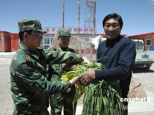 5月10日,青藏高原行車(chē)的中國(guó)汽車(chē)兵路過(guò)位于青海省可可西里國(guó)家自然保護(hù)區(qū)的索南達(dá)杰保護(hù)站,把新鮮的蔬菜和副食品送到工作人員手中。中新社發(fā) 吳蘇琳 攝