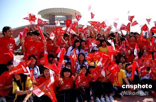 眾多僑鄉(xiāng)學(xué)子在泉州閩臺緣博物館沿途歡迎奧運圣火。中新社發(fā) 傅丹丹 攝