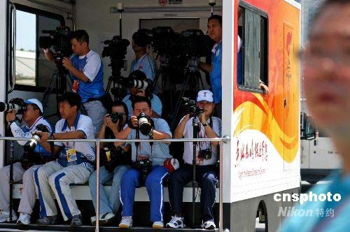 圖為采訪車上的記者嚴陣以待,拍攝圣火傳遞。中新社發(fā) 傅丹丹 攝