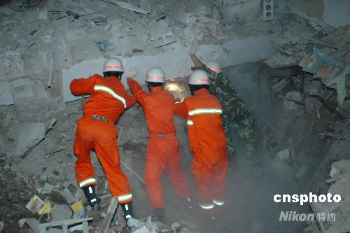 12日下午2:30左右,受四川汶川地震波及,重慶市梁平縣文化鎮(zhèn)一小學(xué)教學(xué)樓發(fā)生垮塌。13日凌晨1時許,搜救工作已全部結(jié)束,垮塌造成5人死亡,36人受傷。圖為消防隊員正在進(jìn)行搜救。 中新社發(fā) 郭虹 攝