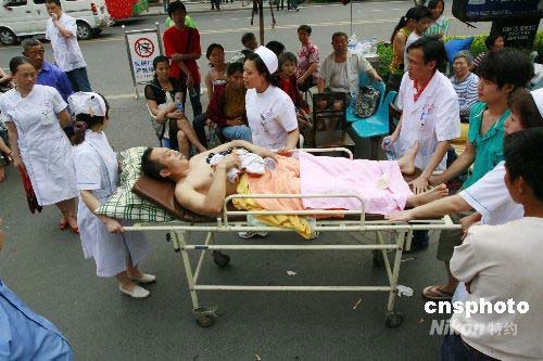 5月12日,四川省遂寧市船山區(qū)人民醫(yī)院將病人疏散到安全地帶繼續(xù)治療。當日14時28分,四川汶川發(fā)生7.8級地震,波及幾百公里之外的遂寧市,時間持續(xù)2分多鐘,造成當?shù)夭糠址课莸顾=刂拱l(fā)稿之時,人員傷亡情況正在統(tǒng)計之中。目前當?shù)卣呀?jīng)啟動緊急預(yù)案,城市將人員疏散到安全地帶,群眾情緒穩(wěn)定,社會持續(xù)井然。中新社發(fā) 鐘 敏 攝